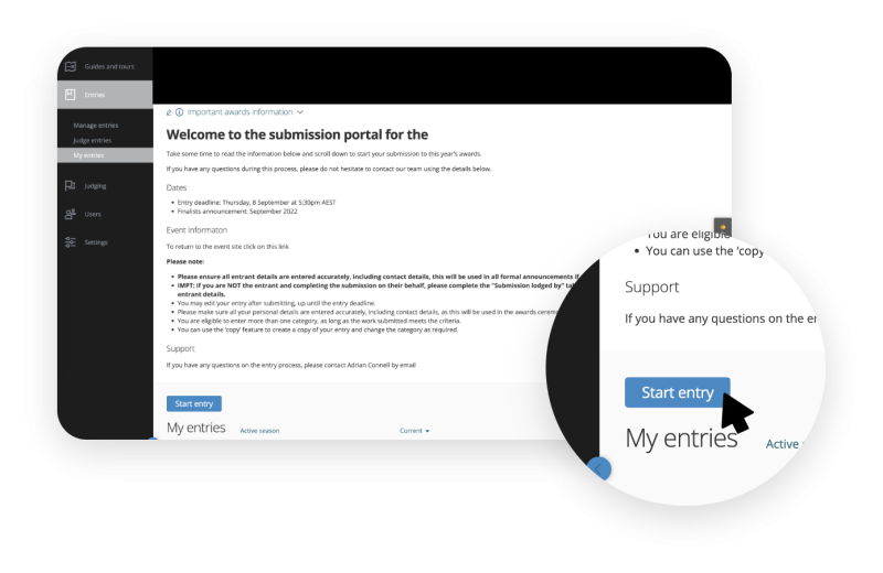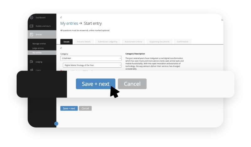 To submit an entry, fill all the fields across the different tabs and provide answers to the questions.