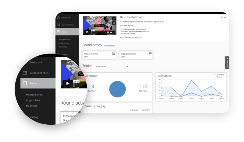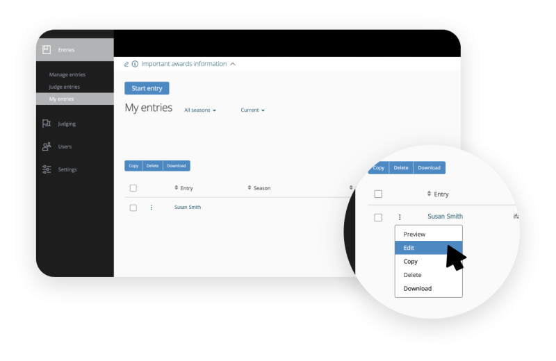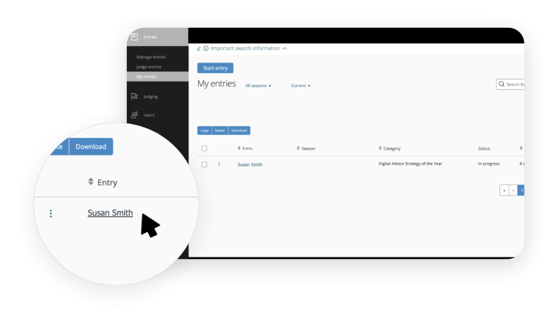 Once you log into the platform, click on the entries drop down menu on the left hand side of your screen, and click on my entries.